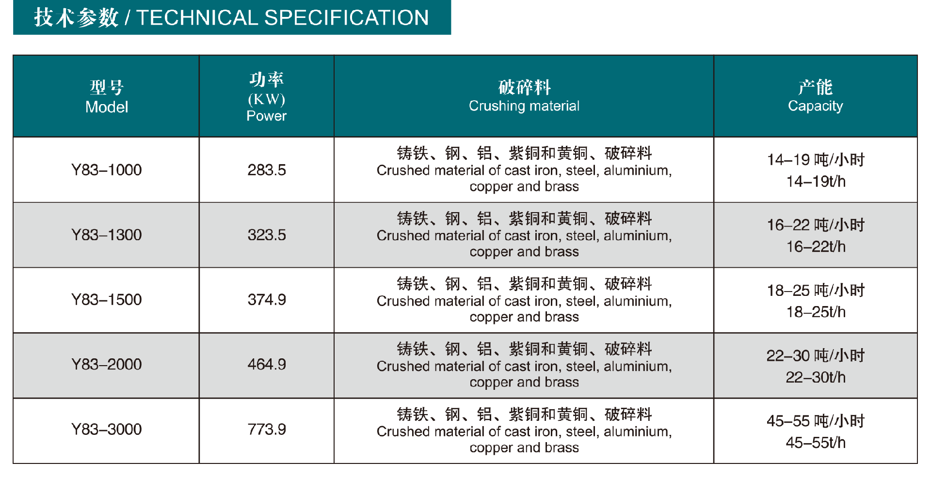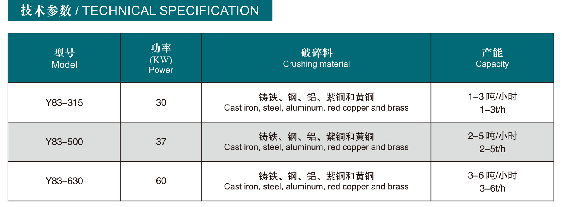本公司生產的Y83系列立式壓餅機和臥式雙主缸壓餅機是為加工處理大量破碎料的高性能機器, 破碎料包括鑄鐵、鋼、鋁、紫銅和黃銅, 另外, 也可以處理研磨漿與金屬碎屑的混合物。